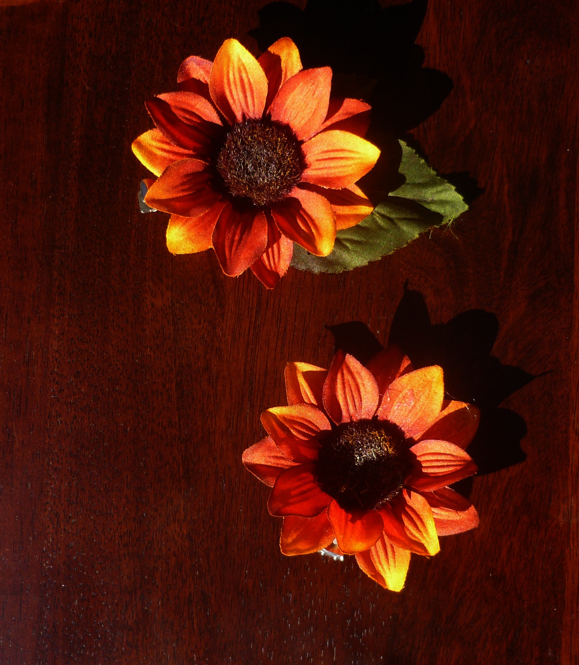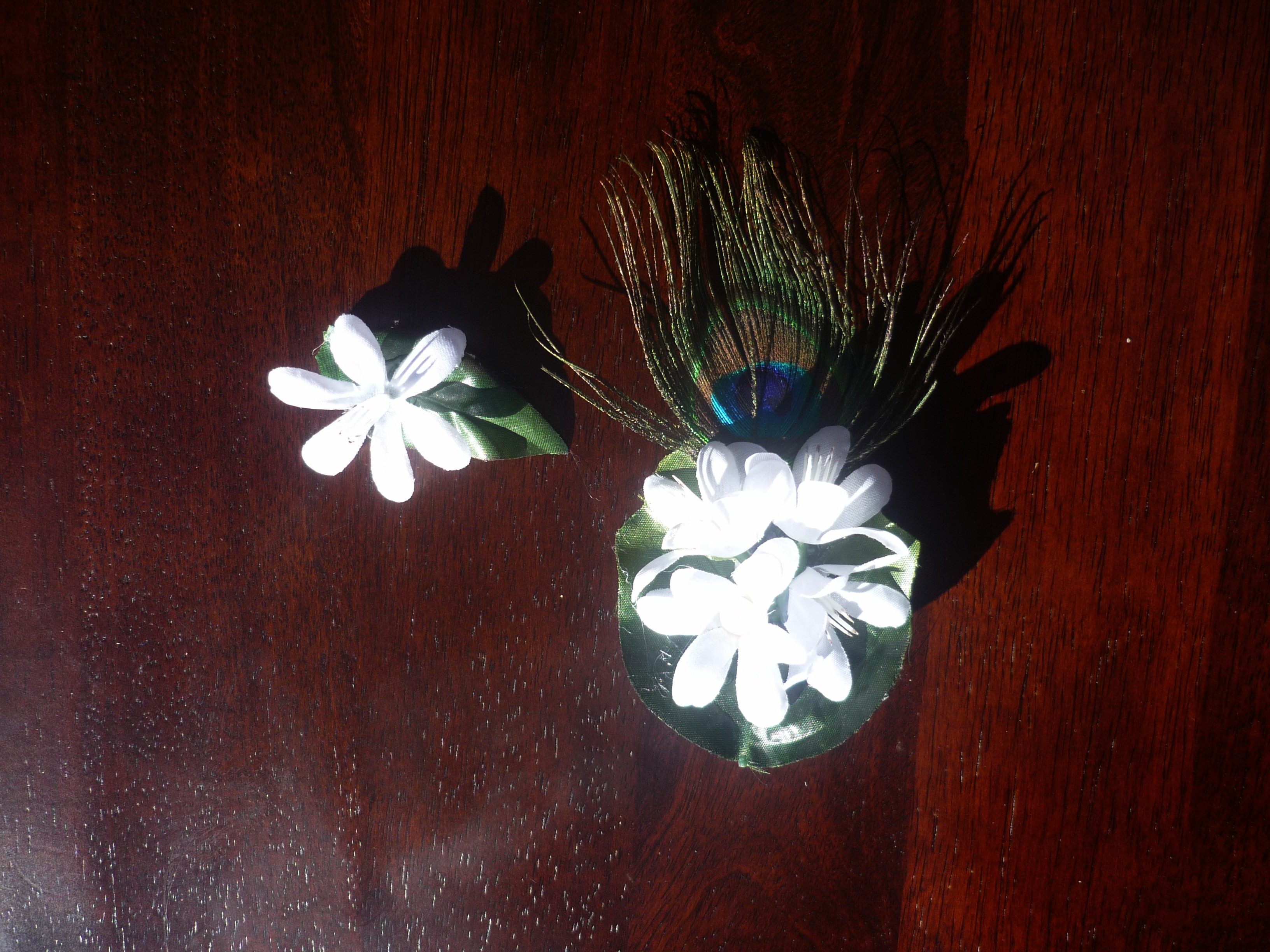 The flowers are securely fixed on hair clips, (small,medium, large or extra large). Some includes several flowers, peacock feathers or beads.
